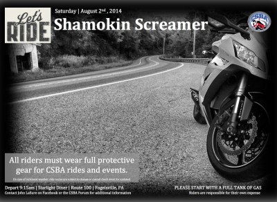 Thanks again for everyone's support in our ride/event and our efforts to make our **Rain Date** Shamokin Screamer Ride a success. Come out and enjoy our next track and riding events, which will be our CSBA “Day @ the Races (Track Day) | Saturday August 30th, 2014 at NJMP ThumberBolt and our scheduled street ride "Rattlesnake Run” on September 6th, 2014. Hopefully we'll see you there!