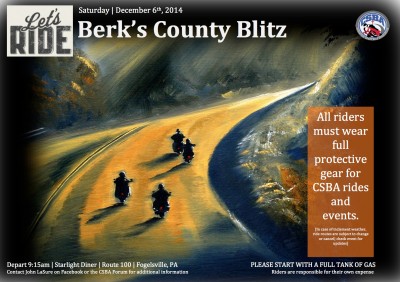 On Saturday, December 6th, the Eastern Pennsylvania Chapter of the Christian Sport Bike Association will be having it’s final scheduled ride of the year - our December Monthly Ride - The “Berks County Blitz”. We will be meeting at the Starlight Diner in Fogelsville for breakfast around 8am and the ride plans to depart at 9:15am, so please be ready. Late comers might get left, so don't be late!